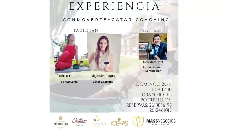 El domingo 29 de noviembre de 10 a 12.30 se lanzará la “Experiencia ConMoverte + Catar Coaching” en el Gran Hotel Potrerillos. Esta experiencia combina la práctica ConMoverte, inspirada en el yoga, la danza y diversas técnicas de autoconocimiento, con Catar Coaching, una metodología creada por la coach y sommelier Sabrina Curti que combina una cata de vinos con neurociencias, coaching.