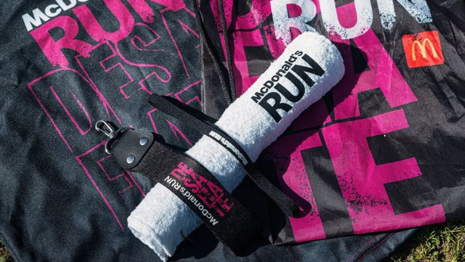 El kit McD RUN incluye una remera, una mochila marinera, un set de vinchas, una toalla comprimida y un llavero.