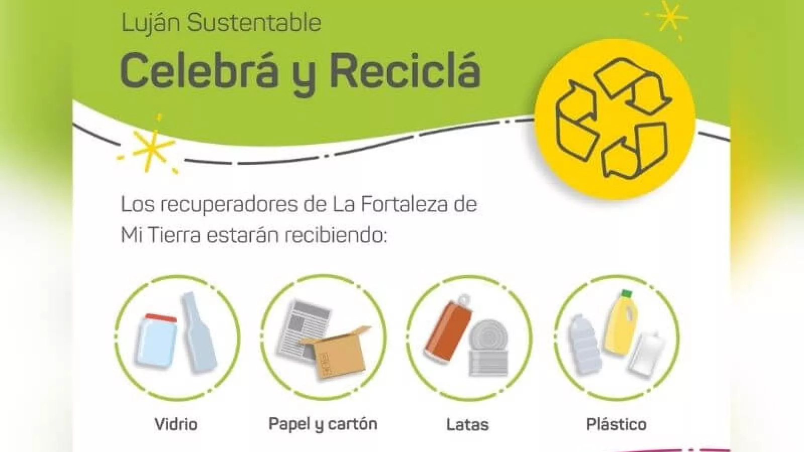 La época de las celebraciones de fin de año son momentos para compartir entre familiares y amigos, pero, a su vez, producen gran cantidad de residuos. En tal sentido, pensando en la solidaridad del espíritu navideño, la comuna y la Cooperativa de recuperadores lujanina, que cumple funciones en el Centro Verde Luján, invitan a los vecinos a separar los residuos generados en los festejos, teniendo en cuenta que la gran mayoría son reciclables: botellas de vidrio y plástico, latas de todo tipo y papeles y cartones de los regalos.