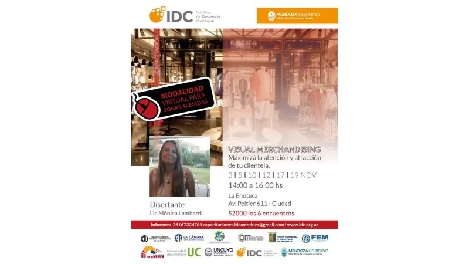 “Visual Merchandising. Maximizá la atención y atracción de tu clientela” se llevará a cabo en seis encuentros a partir de 3 de noviembre y se extenderá durante los días 5, 10, 12, 17, y 19 de noviembre, de 14 a 16, en La Enoteca, Peltier 611, Ciudad de Mendoza.