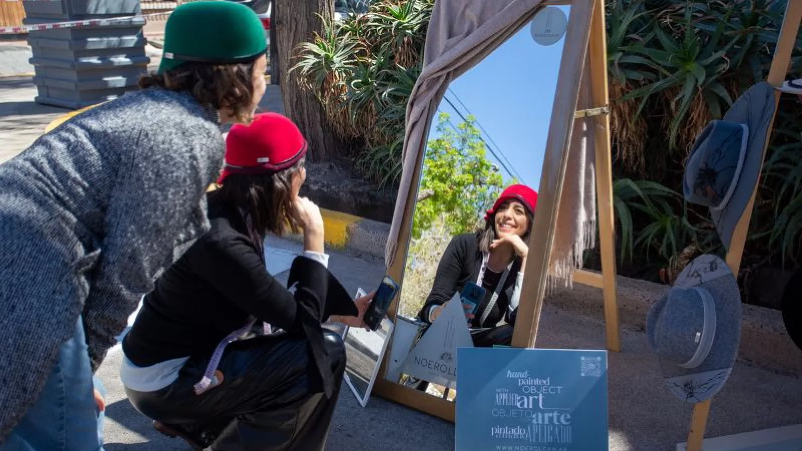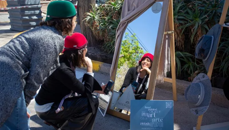 Noe trabaja con sombreros artesanales con técnicas tradicionales -hormas de madera, vapor y costuras hechas 100% a mano- y los interviene con arte botánico vinculado a la identidad regional. Sus diseños incorporan elementos inspirados en la industria del vino, como las hojas de Pinot Noir o Malbec, y en los colores de la cordillera de los Andes, además de flores y formas ligadas a la gastronomía mendocina. Su propuesta, que une la tradición de la sombrerería con un valor artístico propio de nuestra región, llamó la atención de vecinos y turistas que recorrieron la Plazoleta Francia para disfrutar del Mercadito.
