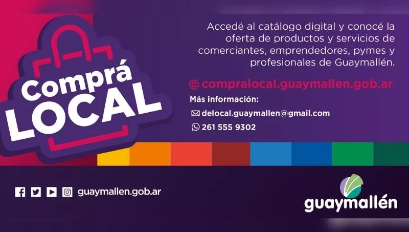 Continúa abierta la convocatoria para Pymes, emprendedores, profesionales y comerciantes de Guaymallén que deseen sumarse a este programa. Para ello deben enviar un mensaje al 2615559302, perteneciente al área de Desarrollo Local y Comercial, con los siguientes datos: nombre del comercio, domicilio, logo, rubro, teléfono/WhatsApp, correo electrónico, redes sociales, medios de pago, una pequeña descripción o slogan e indicar si trabajan con envíos a domicilio. Vale aclarar que es necesario que renueven su inscripción cada mes para seguir participando.