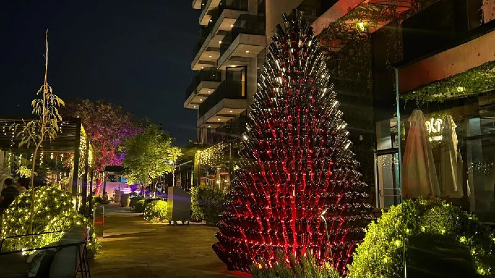 La instalación se encuentra en los jardines del hotel, sobre la calle Primitivo de la Reta, en pleno centro de la ciudad de Mendoza, y busca representar la esencia del hotel bodega y una auténtica Navidad mendocina. Para su armado se utilizaron más de 900 botellas de Huentala Wines. La estructura, fabricada completamente en hierro, alcanza los 3,5 metros de altura, es modular y puede desarmarse en su totalidad. El árbol permanecerá exhibido hasta el 11 de enero.