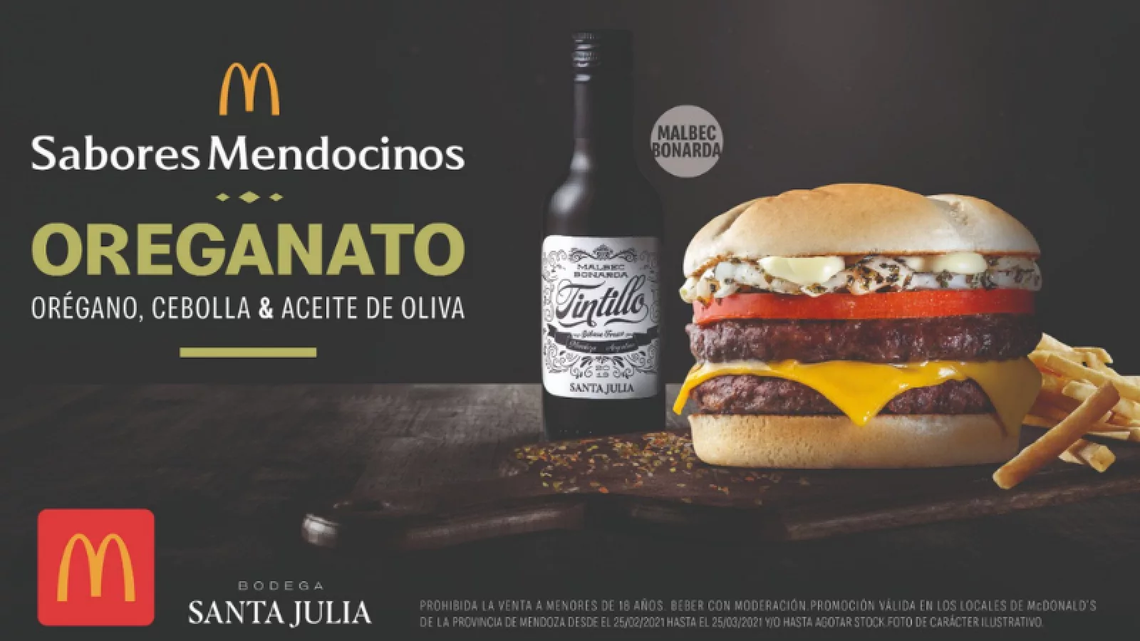 Oreganato es una propuesta que combina a la perfección la gastronomía local con el sabor inconfundible de McDonald's. Este combo especial cuenta con pan estilo criollo, doble carne, tomate, queso cheddar, orégano, cebolla y aceite de oliva. Maridado con un buen vino de nuestra tierra, Tintillo de la Bodega Santa Julia.